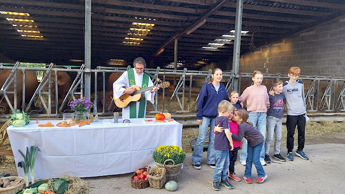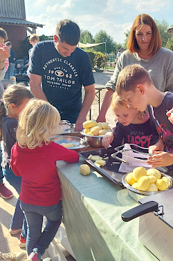 Bei strahlendem Sonnenschein erfuhren Kinder wie Eltern spannende Details über die Kartoffelpflanze und waren anschließend aufgefordert, selbst aktiv zu werden: Vom Ausbuddeln bis zur Verarbeitung der Kartoffel zum fertigen Kartoffelgericht waren Einsatzbereitschaft und Teamarbeit gefragt. Mit Unterstützung von Margot und Heinrich van den Berg, unserer Gastgeberfamilie, zauberte die Gruppe drei verschiedene, frisch zubereitete Kartoffelgerichte: Kartoffelpuffer mit Apfelmus, Pommes und Kartoffelsalat. In der wohl verdienten Pause hatten vor allem die Kinder Gelegenheit, den Tiere auf dem Weidenhof (u.a. Pferde, Katzen, Hühner, Meerschweinchen) ganz nah zu kommen und sich auszutoben. Beim abschließenden Familiengottesdienst unter freiem Himmel hieß es dann „Danke sagen“: Danke für den reich gedeckten Tisch und danke für die Gemeinschaft, die wir erleben durften!